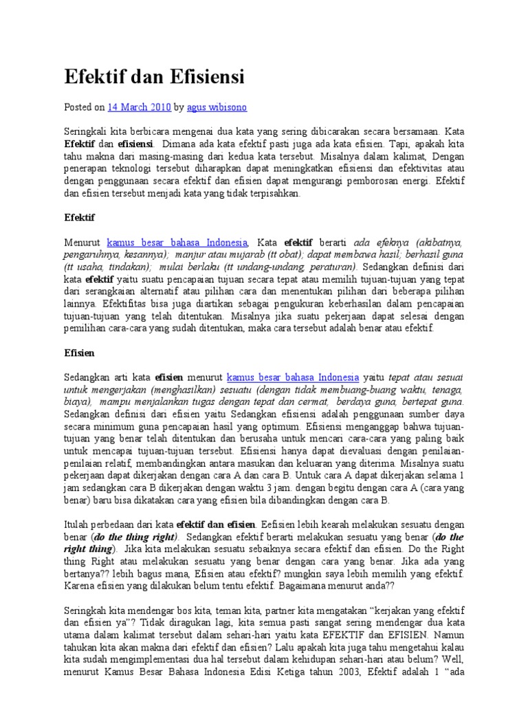 Idealnya semua orang perusahaan ingin sekaligus efektif dan efisien. Aplikasi kamus besar bahasa indonesia kbbi ini merupakan kbbi daring dalam jaringan online tidak resmi yang dibuat untuk memudahkan pencarian penggunaan dan pembacaan arti kata lemasub lema. Kebanyakan dari kita memahami bahwa arti efektif dan efisien itu sama padahal dalam ilmu ekonomi dua kata tersebut memiliki arti yang berbeda. Namun keduanya tidak selalu berjalan bersama kadang bisa efektif namun tidak efisien atau efisien tapi tidak efektif atau.