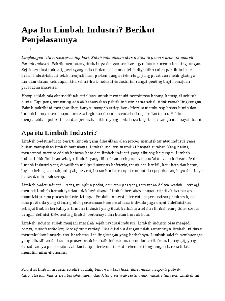 Limbah pabrik mencemarkan air di daerah sekitarnya 3 barang rusak atau cacat dalam proses produksi. Hasil dari proses industri yang sudah tidak terpakai itulah yang disebut limbah industri. 2 bahan yg tidak mempunyai nilai atau tidak berharga untuk maksud biasa atau utama dl pembuatan atau pemakaian. 2 bahan yang tidak mempunyai nilai atau tidak berharga untuk.