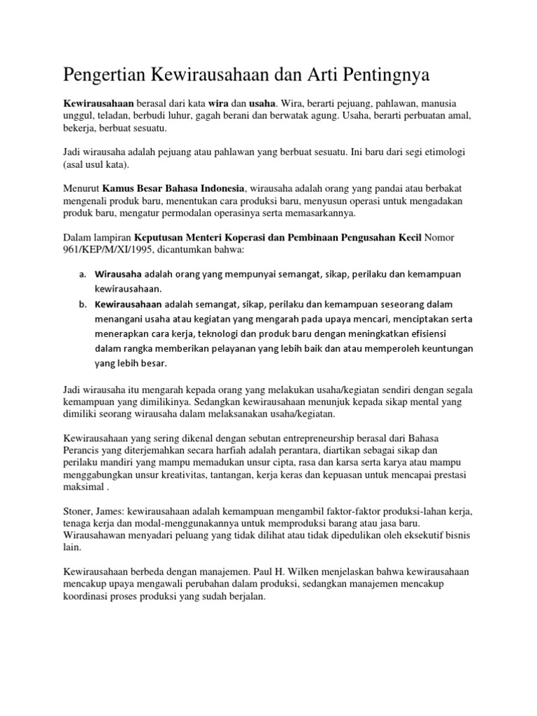 Arti kata kewirausahaan sendiri berasal dari kata wira usaha yang beraarti usaha yang dilakukan sendiri. Wira berarti berani sedangkan usaha berarti usaha. Sedangkan usaha berarti perbuatan untuk mencapai sebuah tujuan. Berikut ini adalah arti makna pengertian definisi dari kata wira menurut kamus besar bahasa indonesia kbbi online dan menurut para ahli bahasaarti kata wira wi ra 1 n pahlawan.