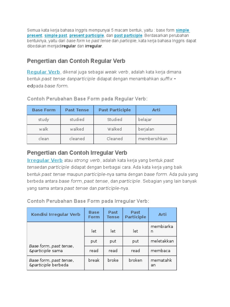 Sedangkan untuk irregular verb tidak ada aturan untuk kata kerja ke dua dan ke tiga jadi. Kata kerja verb dalam penggunaannya adalah untuk menyampaikan suatu tindakan bring read walk run study etc suatu kejadian happen become etc atau sesuatu yang sedang terjadi be exist stand etchampir setiap kalimat membutuhkan kata kerja. Pada suatu kalimat bisa terdiri dari satu verb atau lebih dari satu verb setelah subject. Dan berdasarkan bentuk dan penggunaannya dalam kaidah tenses waktu verb dalam bahasa inggris dikategorikan dalam 2 jenis.