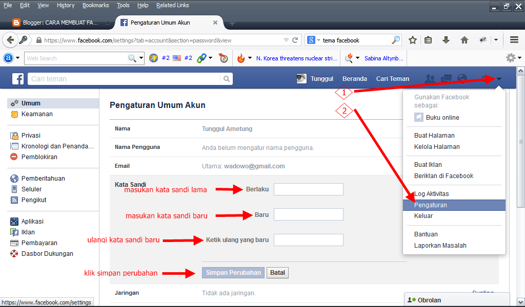 Jika anda menggunakan kata sandi yang sama pada akun surel perbankan dan facebook akan lebih mudah bagi orang lain untuk meretas semua informasi setelah mengetahui salah satu kata sandi akun. Masukkan kata sandi saat ini dan yang baru lalu ketik ulang kata sandi baru. Kata sandi adalah sesuatu yang sangat kita jaga dan tidak boleh menyebarkanya untuk menjaga ke amanan akun termasuk kata sandi faceook. Kata sandi facebook harus kita jaga dan perlu di ganti jika.