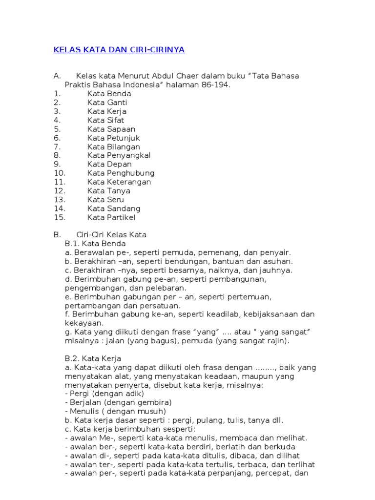 Ciri ciri kata sifat. Ciri ciri kata sifat. Bisa diingkaridibatalkan sifatnya dengan kata tidak atau bukan. Untuk kondisi yang menyatakan kata sifat yang bermakna paling maka kata kerjanya tidak dapat di awali oleh imbuhan ter. Kelas kata dalam bahasa indonesia terbagi dalam tujuh macam yaitu kata benda kata kerja kata sifat kata ganti kata keterangan kata tugas dan kata bilangan.