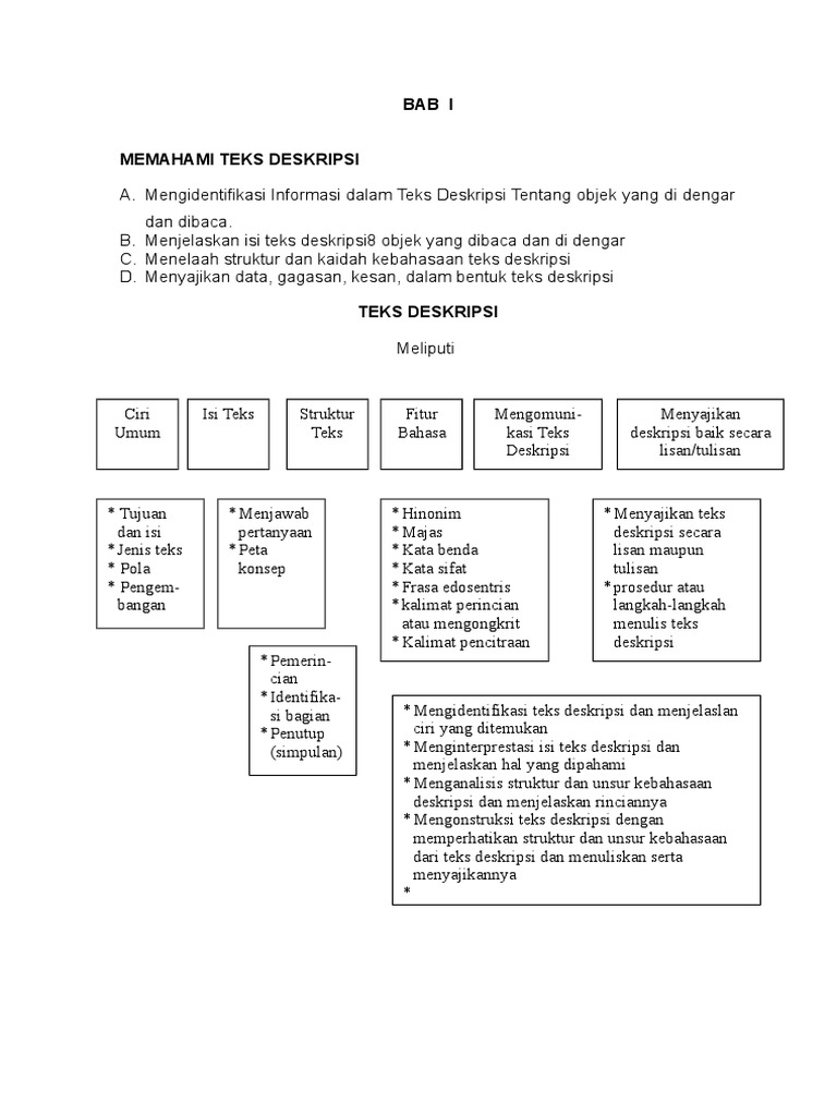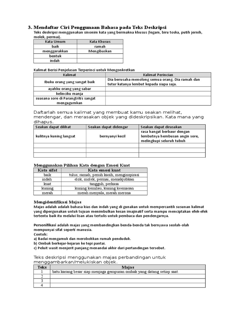 Ciri penggunaan kata pada teks deskripsi. Ciri kebahasaan teks deskripsi. Contoh teks deskripsi teks deskripsi yaitu sebuah teks yang menjabarkan atau memaparkan sebuah objek tertentu melalui kata kata yang dapat merangsang panca indera sehingga pembaca seolah olah menyaksikan atau merasakan sendiri objek yang dideskripsikan oleh penulis. Dengan demikian teks deskripsi banyak menggunakan kata khusus warna dikhususkan pada kata hijau biru toska oranye isi teks deskripsi bersifat personal dengan kandungan emosi sehingga menggunakan kata kata dengan emosi kuat ombak menggempur kemolekan pantai ibuku yang tangguh. Ciri penggunaan bahasa pada teks deskripsi.