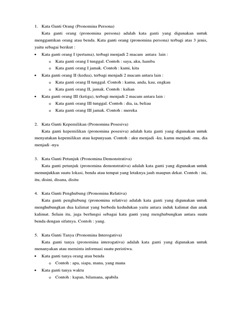 Istilah untuk kata ganti disebut sebagai pronomina. Kata ganti orang disebut juga dengan pronomina persona. Untuk itu kita perlu mengenal kata ganti. Contoh kalimat kata ganti.