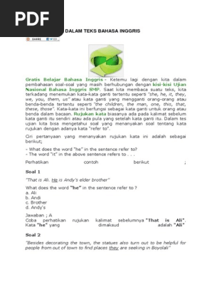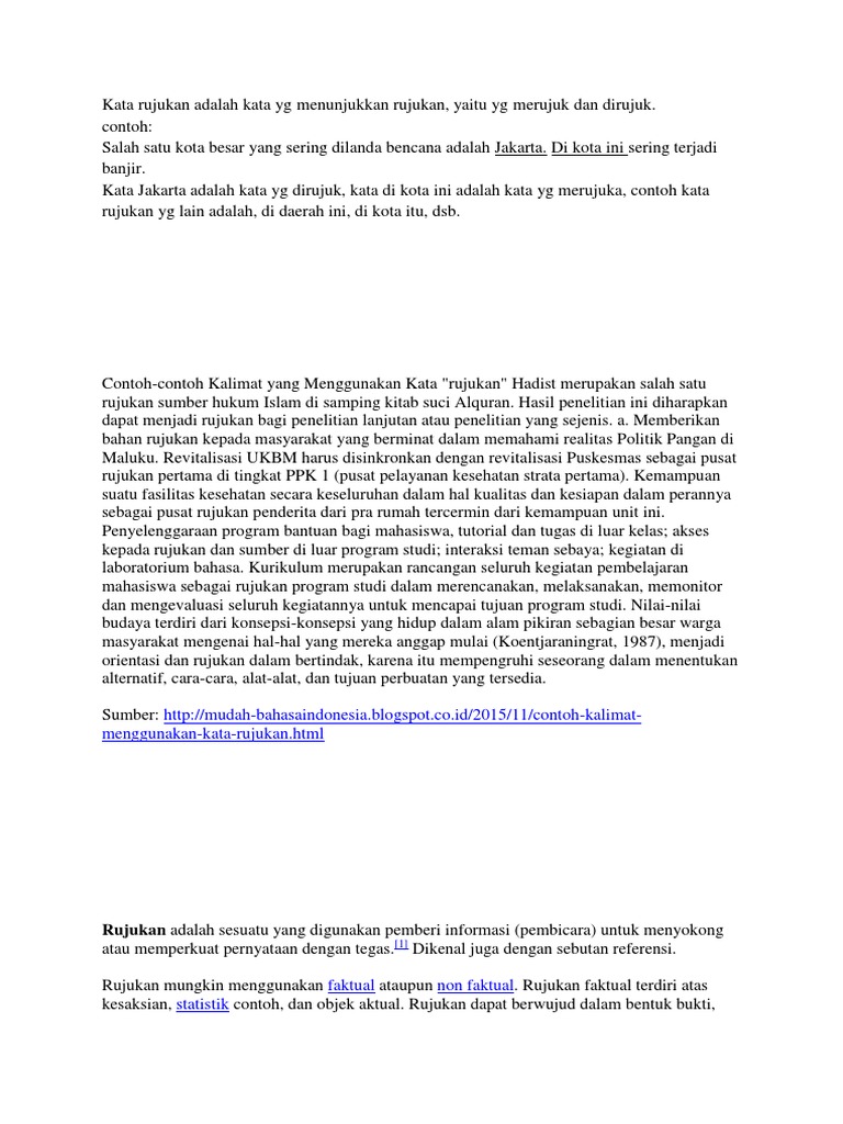 Contoh kalimat rujukan atau contoh kata rujukan. Rujukan kata merupakan unsur bahasa dalam materi bahasa indonesia. Untuk membahas contoh kata rujukan dan kalimat rujukan coba baca beberapa kalimat berikut ini. Kata rujukan umumnya menggunakan kata kata seperti disini disana ini itu dia ia tersebut dll.