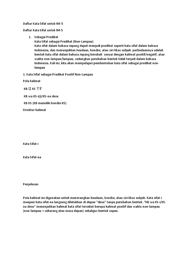 Shizuka na tokoro tempat yang tenang 3. Kata sifat na kata benda kata sifat i kata benda contoh. Jepang adalah negara yang sibuk tapi orang jepang sangat baik nihon wa totemo isogashii kuni desu demo nihonjin wa totemo yasashii desu. Dalam belajar bahasa jepang penggabungan kata sifat sama saja dengan bahasa indonesia tinggal disejajarkan saja kedua kata tersebut namun polanya terbalik.