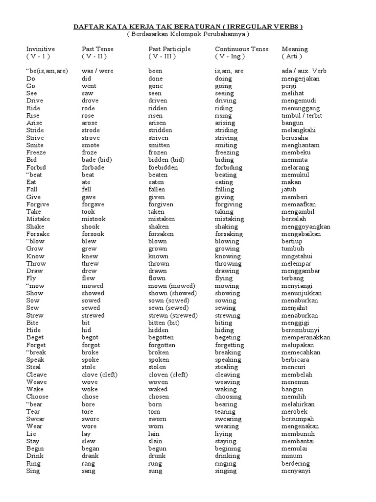 Irregular verb adalah kata kerja yang bentuk perubahannya tidak tetap atau tidak beraturan atau mengalami infleksi kenapa disebut tidak beraturan. Daftar kata kerja tak beraturanirregular verb lengkap kata kerja tak beraturan atau irregular verb adalah suatu penyebutan kata kerja dalam bahasa inggris dimana kata kerja tersebut memiliki bentuk yang tidak teratur dalam perubahannya. Demikianlah pembahasan materi kali ini mengenai 500 daftar kata kerja beraturan dan tidak beraturan dalam bentuk 1 2 dan 3 dalam bahasa inggris lengkap beserta artinya. Thank you for attention friends.