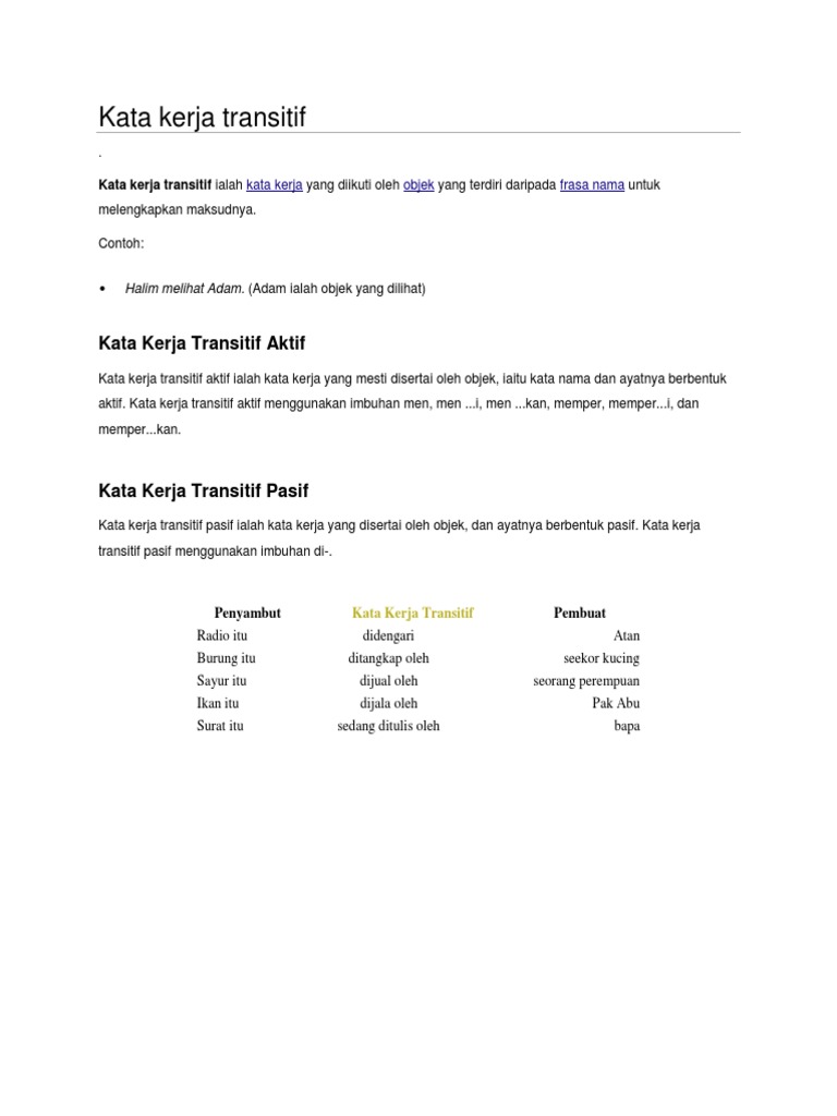 Contoh kata kerja transitif. Arti kata seperti kata transitif di atas ditampilkan dalam warna yang membuatnya mudah untuk mencari entri dan sub tema. Berikut adalah contoh kalimat yang menggunakan kata kerja transitif. Posting pada bahasa indonesia ditag 10 contoh kata kerja transitif 50 contoh kalimat aktif 50 kata kerja transitif 50 kata kerja transitif bahasa inggris apa yang dimaksud dengan faktual apa yang dimaksud dengan kalimat aktif intransitif berikan contohnya berikut yang merupakan kalimat verbal yaitu buatlah 2 kalimat dengan keterangan. Rahimi terhidu bau busuk.