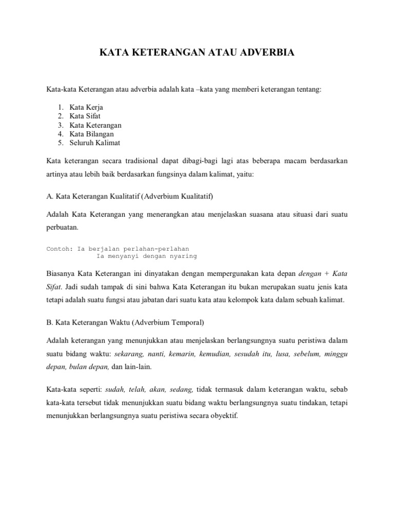 Contoh kata keterangan waktu. Kata keterangan pelaku yakni merupakan kata keterangan yang menjelaskan tentang pelaku suatu peristiwa atau perlakuan tertentu. Kata adverbial ini menunjukkan keterangan waktu saat kegiatan atau peristiwa itu terjadi. Kata sifat adjektiva kata kerja verba terkecuali kata benda nominakata keterangan berdasarkan bentuknya dapat dibedakan menjadi beberapa macam diantaranya ialah keterangan cara keterangan alat. Contoh kata keterangan waktu dalam kalimat yakni.