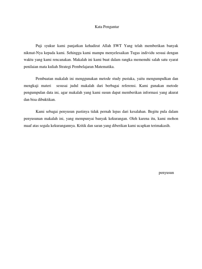 Contoh kata pengantar makalah individu. Atas segala karunia nikmatnya sehingga saya dapat menyusun makalah ini dengan sebaik baiknya. Segala puji bagi allah swt yang telah memberikan penulis kemudahan dalam menyelesaikan makalah tepat waktu. Contoh kata pengantar makalah individu telaah kurikulum kata pengantar puji dan syukur saya ucapkan kehadirat tuhan yang maha esa sebagai pencipta atas segala kehidupan yang senantiasa memberikan rahmat nya sehingga saya dapat menyelesaikan tugas makalah ini dengan judul telaah kurikulum.