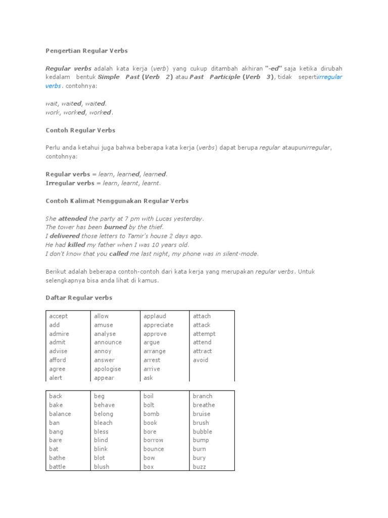 Contoh kata regular verb. Irregular verb sebelumnya kita telah menuliskan tentang kosakata kata kerja dan juga daftar regular verb yang biasa digunakan dalam kehidupan sehari hari. Base form simple present verb 1 simple past verb 2 present participle ing dan past participle verb 3. Verb adalah kata kerja sedangkan regular verb adalah kata kerja berarturan. Kata kerja tersebut hanya ditambah akhiran ed d atau ied dari bentuk dasar.