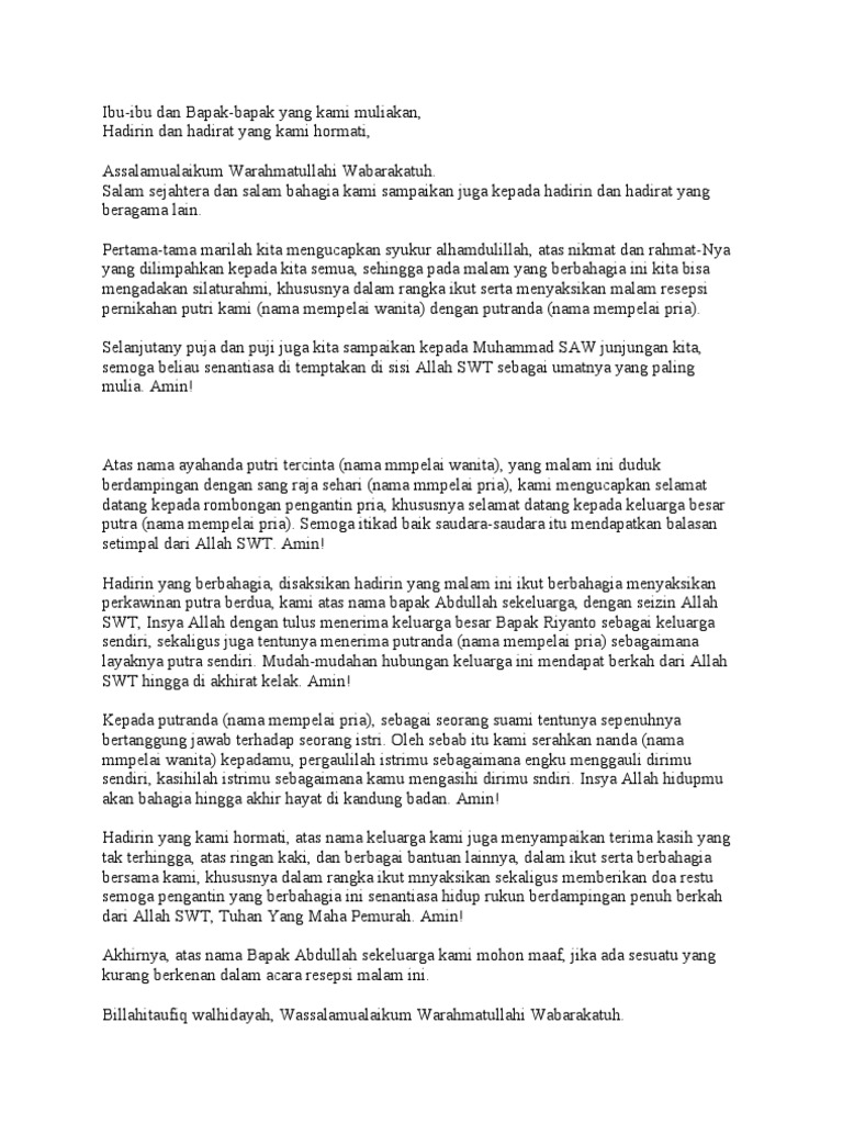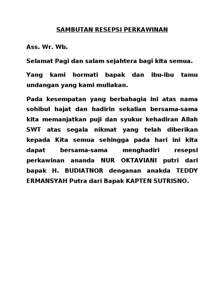 Demikianlah kata sambutan ini mohon maaf sebesar besarnya bila terdapat kesalahan kekhilafan kami khususnya di dalam penerimaan dan pelayanan pelaksanaan resepsi pernikahan ini. Demikianlah kata sambutan ini mohon maaf sebesar besarnya bila terdapat kesalahan kekhilafan kami khususnya di dalam penerimaan dan pelayanan pelaksanaan resepsi pernikahan ini. Itulah contoh kata sambutan pernikahan yang bisa kamu jadikan referensi. Pada kesempatan kali ini kami akan memberikan informasi tentang contoh sambutan keluarga acara resepsi pernikahan.