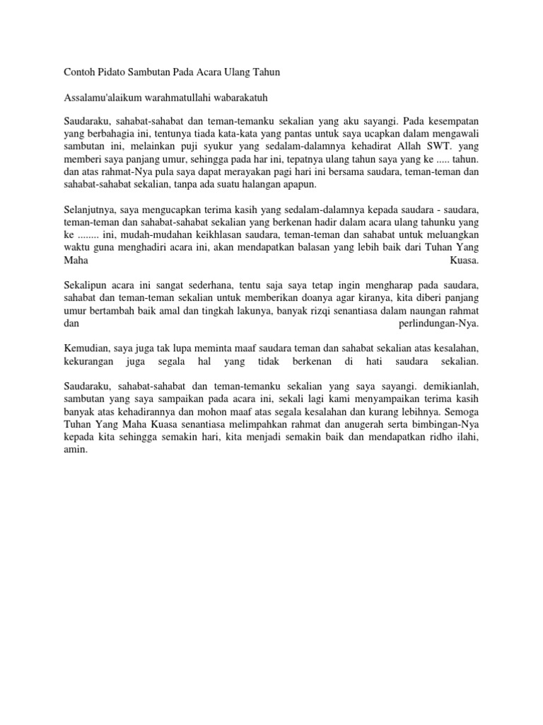 Contoh kata sambutan ulang tahun singkat. Contoh pidato sambutan pada acara ulang tahun. Dengan mempelajari pidato sambutan pada acara ulang tahun anda bisa mempersiapkan sebelunya agar nantinya anda tidak menjadi malu dan tidak menjadi perbincangan orang karena gugup atau salah mengucapkan perkataan dalam. Semoga artikel diatas dapat bermanfaat untuk kita semua. Pidato sambutan pada acara ulang tahun adalah sesuatu yang penting dan tentunya harus disiapkan secara matang sebelumnya agar nantinya acara ulang tahun menjadi lancar.