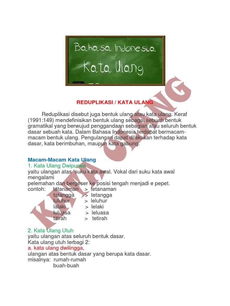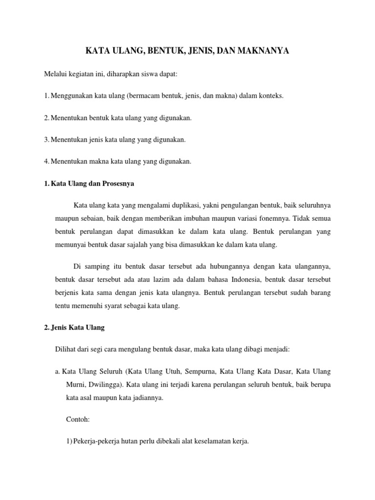 Kata ulang merupakatan kata yang dihasilkan dari proses reduplikasi atau pengulangan. Di sekitar lereng gunung daun jatuh. Contoh kata ulang utuh adalah anak anak murud murid bapak bapak panjang panjang ciri ciri dan lain sebagainya. Anak anak tipe warisan ibu ayah.