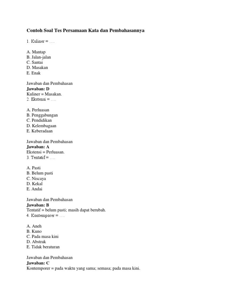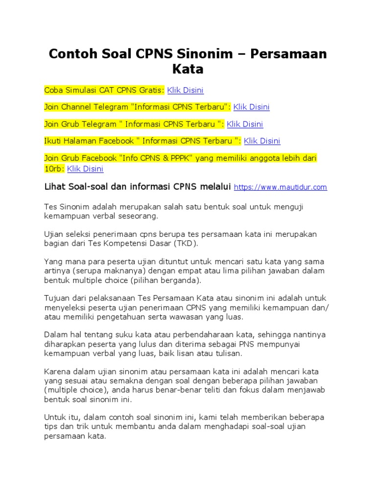 Apabila sobat sudah merasa mahir dalam mengerjakan soal untuk materi persamaan kata sinonim ini pak habe sarankan untuk mengerjakan simulasi ujian soal tpa persamaan kata sinonim yang sudah pak habe buat khusus untuk para pembaca setia www. 200 contoh soal cpns 2019 tes sinonim kata persamaan kata tujuan dari pelaksanaan tes persamaan kata atau soal sinonim ini adalah untuk menyeleksi peserta ujian penerimaan cpns yang memiliki kemampuan dan atau memiliki pengetahuan serta wawasan yang luas dalam hal tentang suku kata atau perbendaharaan kata sehingga nantinya diharapkan peserta yang lulus dan diterima sebagai pns mempunyai. Tes sinonim adalah merupakan salah satu bentuk soal untuk menguji kemampuan verbal seseorang. Pada soal cpns 2019 sinonim ini akan kami bagi dalam beberapa bagian.