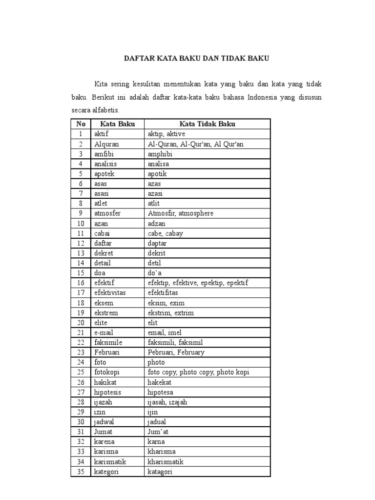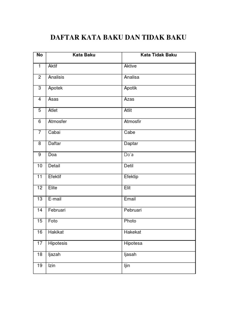 Daftar kata baku dan tidak baku aktif aktip aktivitas aktifitas al quran alquran analisis analisa anda. P engertian kata baku yaitu kata yang sesuai dengan aturan kaidah bahasa dan kata tidak baku berarti sebaliknya. Berikut adalah contoh 300 kata baku dan tidak baku. No kata baku kata tidak baku 1 aktif aktip aktive 2 alquran al quran al quran al quran 3 amfibi amphibi 4 analisis analisa 5 apotek apotik 6 asas azas 7 asasi azasi 8 atlet atlit.