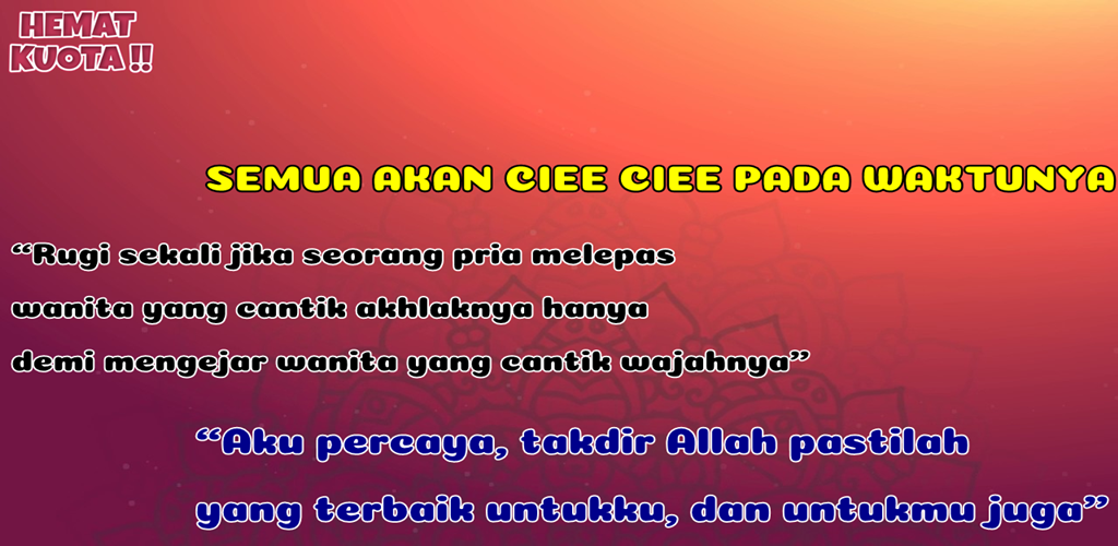 Tidak diarahkan pada peperangan yang selalu menimbulkan korban pada manusia. Inspirasi itulah yang akan menjadikan manusia selalu menjunjung tinggi nilai nilai. Melalui kata kata indah islami yang diambil baik dari kitab suci atau pun syair para ulama teknologi berkembang sebagaimana mestinya. Gambar kata kata islami terbaru mengawali dan menjalani hari demi hari tentu harus berpedoman pada aturan agama sehingga keridhoan dari allah swt dapat diraih demi keselamatan di dunia dan di akhiratpasalnya setiap tindak tanduk yang kita lakukan di dunia harus dilandasi dengan nilai nilai agama supaya kita selalu memperoleh perlindungan dari nya.
