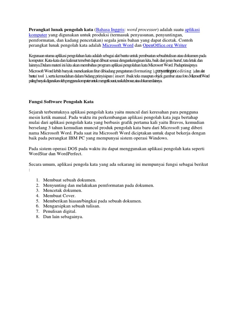 Fungsi perangkat lunak pengolah kata. Daftar perangkat lunak pengolah kata. Bagian bagian dan fungsi perangkat lunak pengolah kata microsoft word 8 months ago tampilan word. Pengertian perangkat lunak pengolah kata software perangkat lunak pengolah kata atau juga bisa disebut word processing adalah suatu aplikasi yang difungsikan untuk mempermudah pekerjaan yang berkaitan dengan dokumen mulai tahap pembuatan penyusunan dokumen maupun dalam penyuntingan dokumen. Procoid perangkat pengolahan kata merupakan perangkat lunak aplikasi yang dibuat untuk digunakan sebagai merida perangka t yang berfungi untuk mengolah kata seperti untuk membuat dokumen surat laporan buku buletin majalah poster dan macam contoh lainnya.