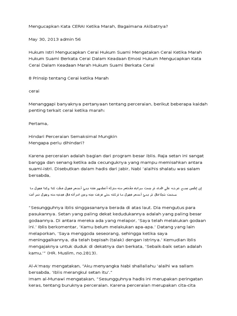 Kamu saya talak kamu saya cerai kamu saya pisah selamanya kita bubar aku lepaskan kamu dan semua kalimat turunannya yang tidak memiliki makna lain selain cerai dan pisah selamanya. Bagikan artikel ini di whatsapp laki laki yang bijak mampu mengendalikan ucapannya dan wanita yang cerdas mampu mengendalikan emosinya sehingga tidak mudah meminta cerai dari suaminya. Jadi meskipun istri kerap kali mengucapkan kata pisah ataupun cerai maka hal itu tidak berlaku. Selama pernikahan tersebut seringkali terjadi pertengkaran antara saya dan suami dari hal hal yang sepele sampai hal hal yang prinsip.