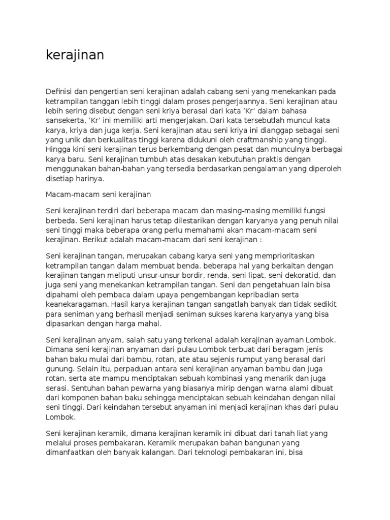 Istilah kerajinan berasal dari kata. Istilah yunani ini menunjuk kepada pengetahuan dan penerapan prinsip prinsip yang diperlukan dalam menghasilkan objek objek dan menyelesaikan tujuan tujuan khusus. Kerajinan terbuat dari berbagai bahan. 3 bahasa prancis. Istilah kerajinan berasal dari kata rajinyang berarti benda atau barang yang dihasilkan oleh keterampilan tangan seseorang.