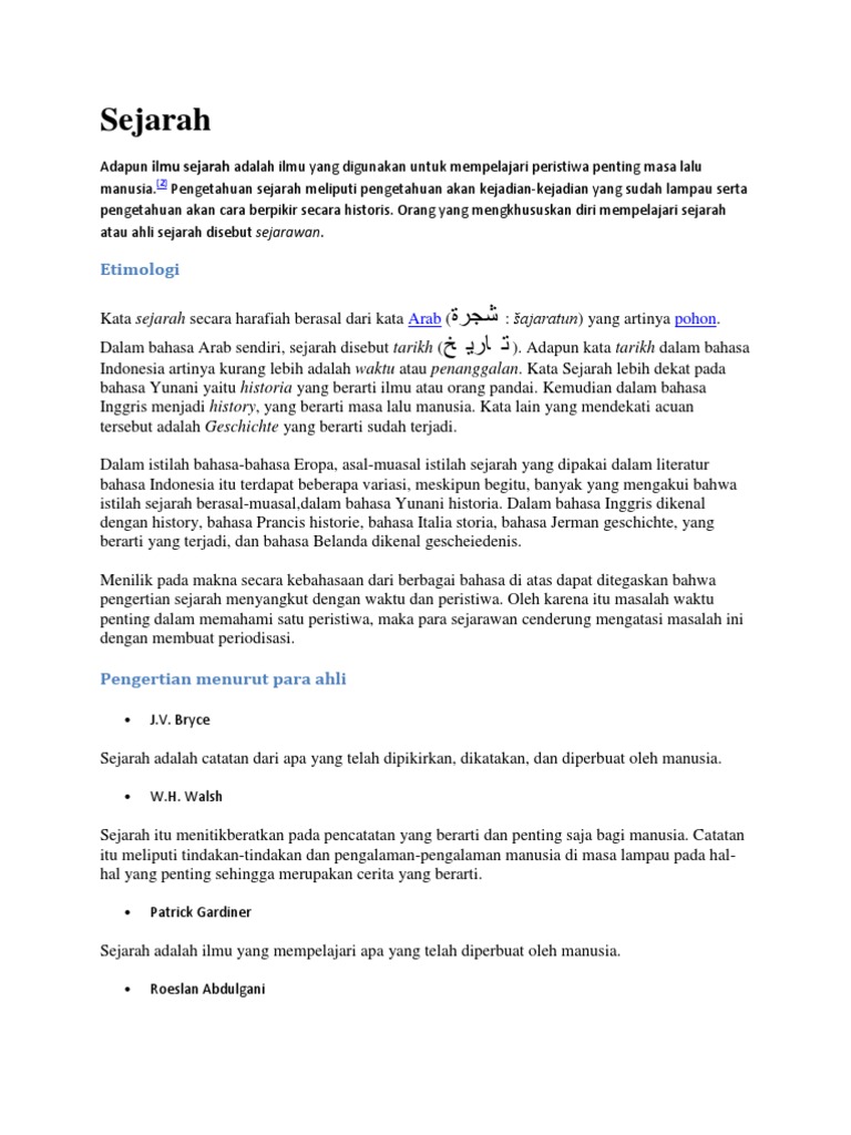 Diantaranya adalah dari bahasa belanda staat. Selain istilah syajaratun yang berasal dari bahasa arab terdapat katakata arab lainnya yang memiliki arti hampir sama dengan kata syajaratun seperti silsilah riwayat atau hikayat kisah dan tarikhistilah lainnya yang berasal dari kata asing yang sama dengan kata sejarah yaitu history dari bahasa inggris geschichte berasal dari bahasa jerman dan gechiedenis berasal dari bahasa belanda. Sejarah dalam bahasa inggris yaitu history yang berarti masa lalu manusia. Adapun kata tarikh dalam bahasa indonesia artinya kurang lebih adalah waktu atau penanggalankata sejarah lebih dekat pada bahasa yunani yaitu historia yang berarti ilmu atau orang pandai.