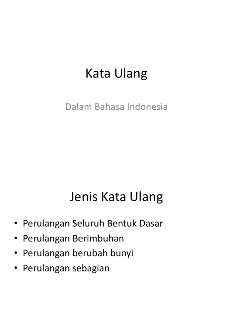 Jenis jenis kata ulang. Adapun menurut sumber yang sama makna dari ulang adalah kata yang terjadi sebagai hasil reduplikasi misal. Jenis kata ulang ini terjadi pada keseluruhan atau semua kata. Adalah karakteristik dari jenis reset kata ini. Kata kata yang mengalami pengulangan sebagian antara lain lelaki leluhur pepohonan dan tetangga.