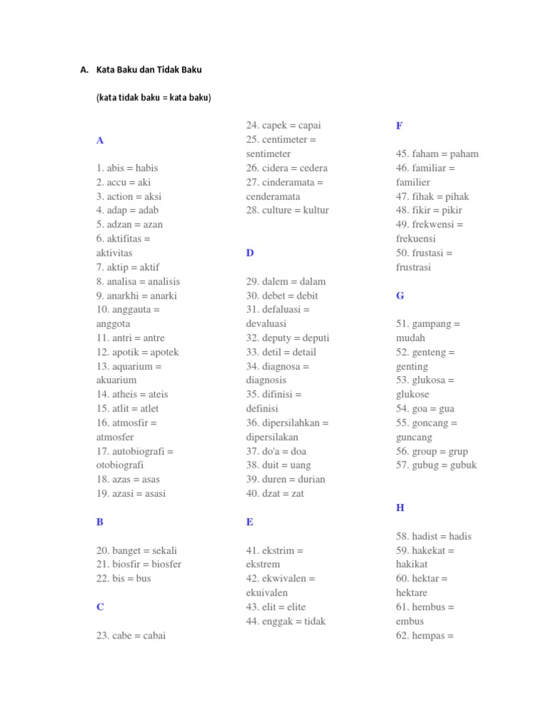 Baku atau tidak bakunya suatu kata ditentukan sesuai pedoman umum ejaan bahasa indonesia yang disempurnakan eyd. Contoh kalimat baku dan tidak baku dalam bahasa indonesia artikel pada kesempatan kali ini kembali membahas mengenai baku dan tidak baku. Artikel ini dibikin bagi siapa saja yang ingin jelas perihal definisi kata baku maupun kata tidak baku pasti telah sering kan mendengar istilah kata. Untuk tahap awal anda sebaiknya mengetahui 250 contoh kata baku dan tidak baku dari a hingga z di bawah ini.