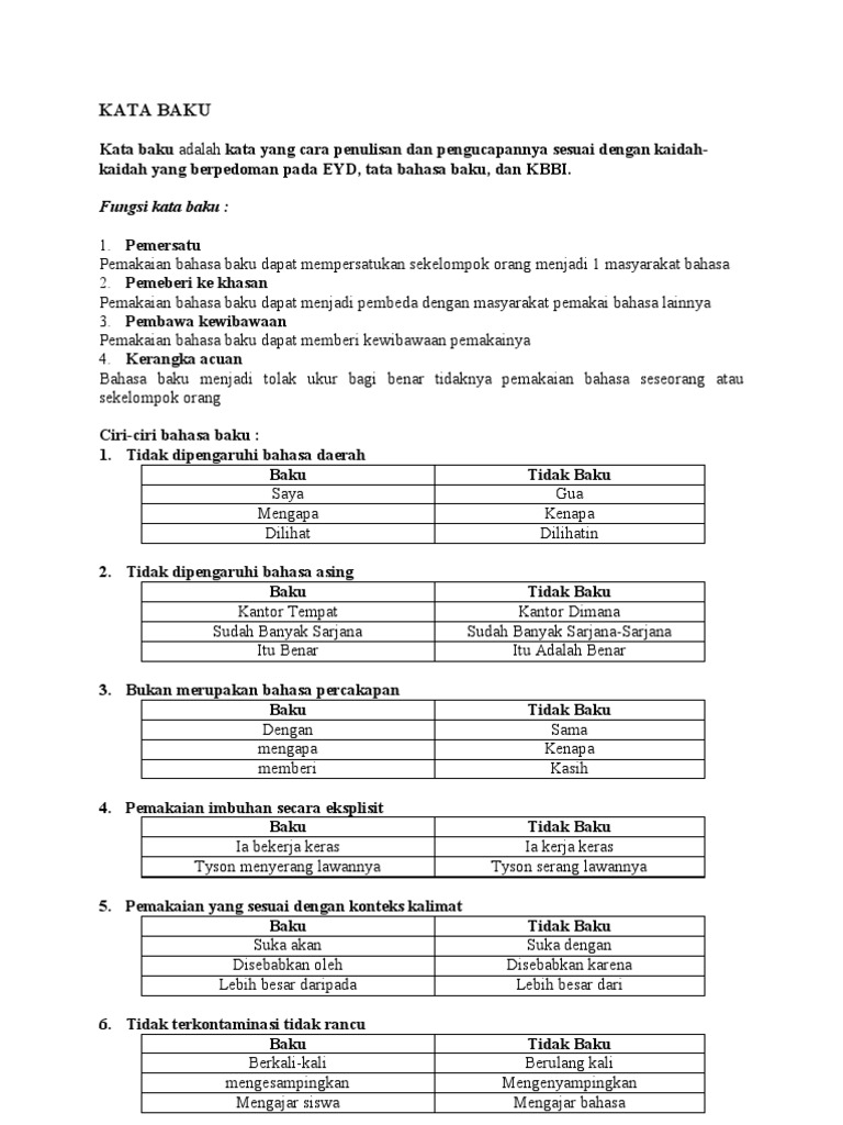 Kata baku dan tidak baku adalah. Biasanya kata tidak baku kerap digunakan kala percakapan sehari hari atau di dalam bahasa tutur. Kata baku adalah kata yang sesuai dengan eyd. Surat menyurat antara organisasi instansi atau lembaga dan lain lain. Baku atau tidak bakunya suatu kata ditentukan sesuai pedoman umum ejaan bahasa indonesia yang disempurnakan eyd.