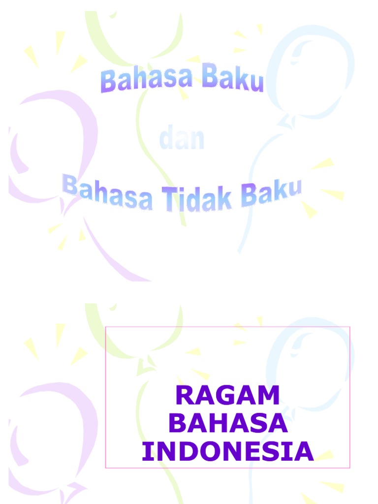 Bahasa baku merupakan ragam bahasa yang diterima untuk dipakai dalam situasi situasi resmi seperti dalam perundang undangan rapat resmi surat menyurat dan sebagainya.
