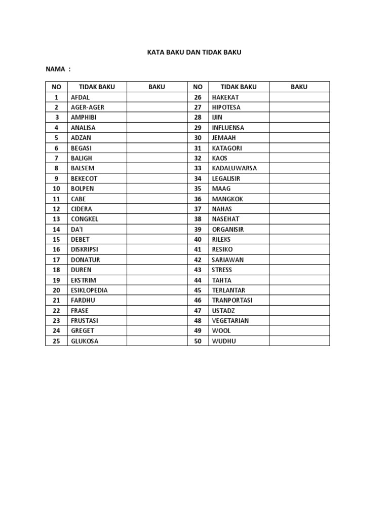 Kata baku tidak baku. Berikut adalah contoh 300 kata baku dan tidak baku. Dalam kamus besar bahasa indonesia atau yang biasa disebut dengan kbbi ada istilah untuk menyebutkan ambiguitas. Tidak baku dia adalah anak yang paling rajin di sekolah berdasarkan buku absen. Baik itu di lingkungan sekolah masyarakat bahkan di lingkungan lainnya pun kata baku dan kata tidak baku sudah menjadi hal yang familiar.
