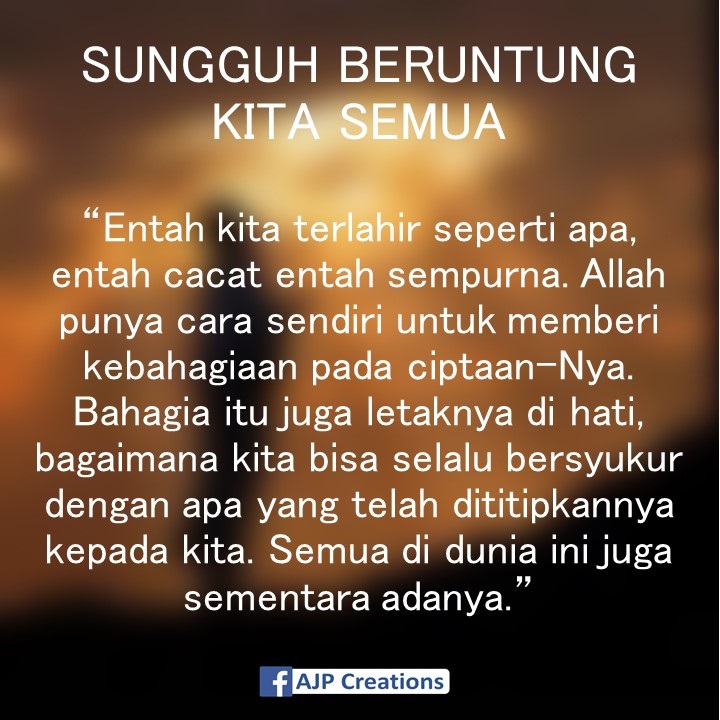 Kata bijak selalu bersyukur. Percayalah bahwa cukup hanya dengan bersyukur kehidupan kita akan jauh lebih bernilai dan berarti. Dengan bersyukur kita dikuatkan dan semakin tumbuh dalam kedewasaan serta iman. Jalan terindah dari kehidupan adalah mensyukuri apa yang telah kita jalani setiap hari tanpa ada. Seolah olah hidup kita tanpa mempunyai beban karena dengan.