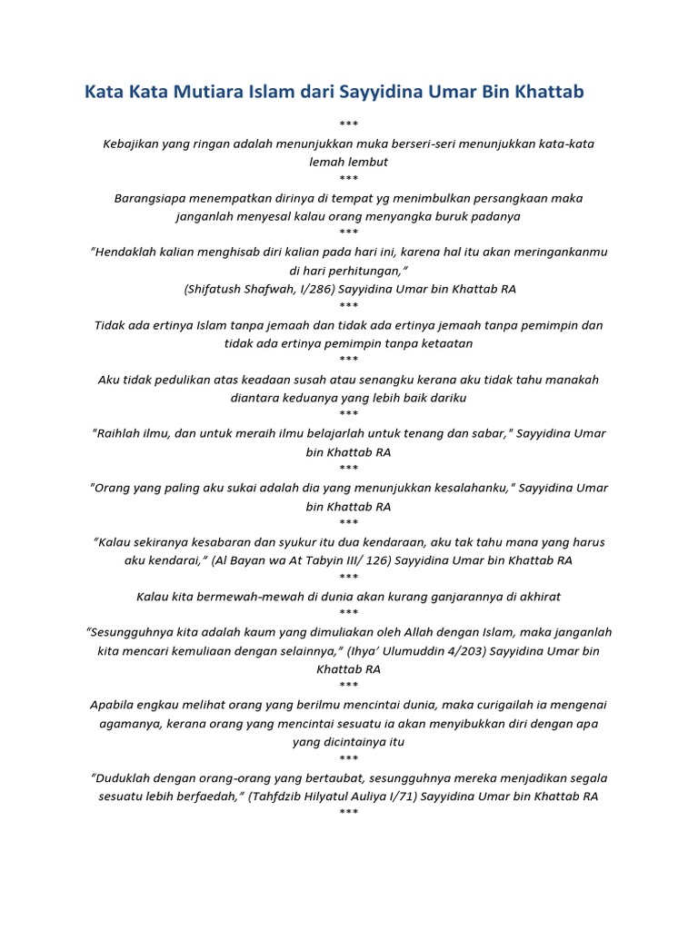Kata bijak umar bin khattab tentang pemimpin. Umar bin khattab merupakan satu di antara sahabat rasulullah saw dan dijuluki oleh sang rasul sebagai al faruq yang berarti orang yang bisa memisahkan antara kebenaran dan kecurangan atau kebohongan. 9 ditemukan tentang umar bin khattab umar bin khattab merupakan seorang khalifah sepeninggalnya abu bakar yakni pada tahun 634 m. Kata bijak islam umar bin khattab umar bin khattab termasuk orang yang sangat terhormat dari suku quraisy. Umar bin khattab ditunjuk sebagai khalifah kedua dalam sejarah islam.