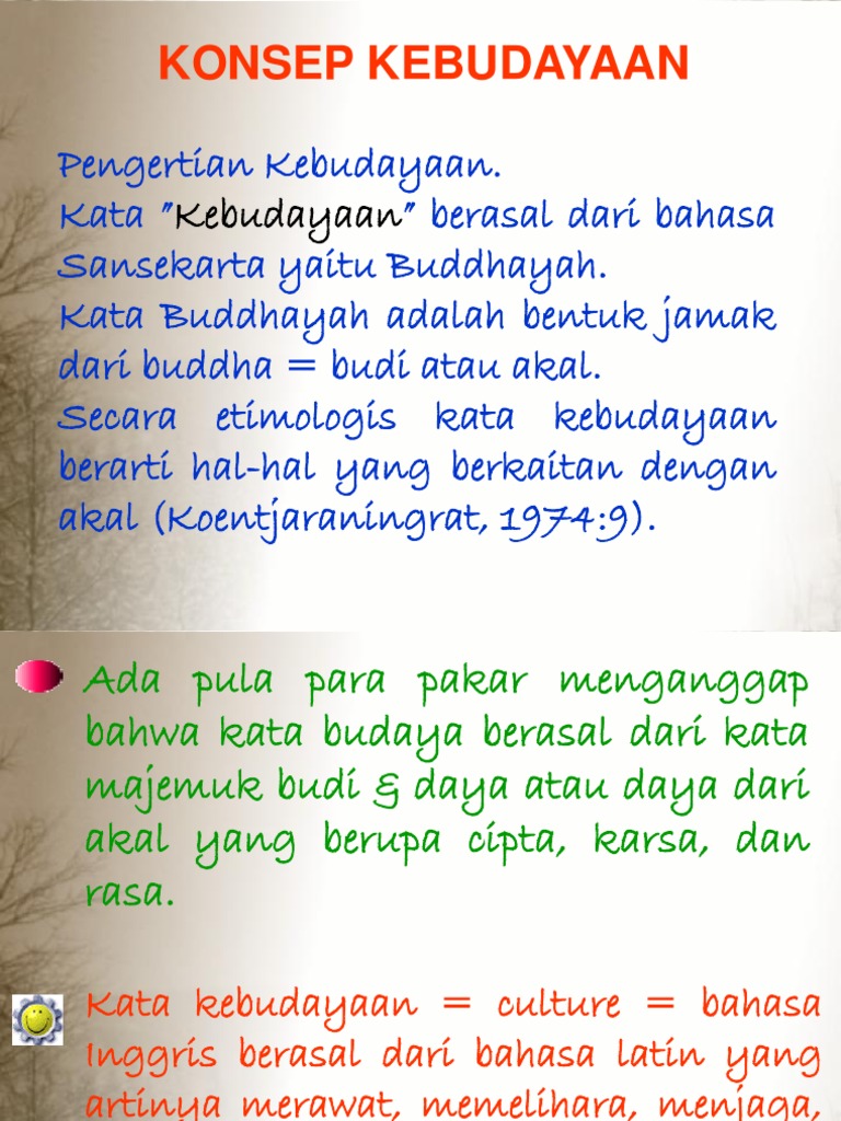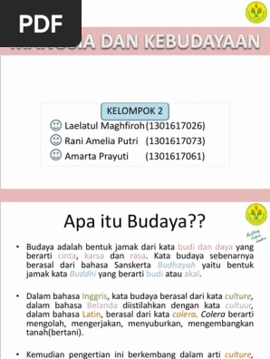 Pengertian budaya kata kebudayaan berasal dari bahasa sanskerta budhayah yaitu bentuk jamak dari budhi yang berarti budi atau akal. Kata tersebut merupakan bentuk jamak dari kata buddi yang berarti akal pikiran atau budi. Budaya atau kebudayaan berasal dari bahasa sanskerta yaitu buddhayah yang merupakan bentuk jamak dari buddhi budia atau akal. Dalam bahasa inggris kebudayaan disebut culture yang berasal dari kata latin colere yaitu mengolah atau mengerjakanbisa diartikan juga sebagai mengolah tanah atau bertani.