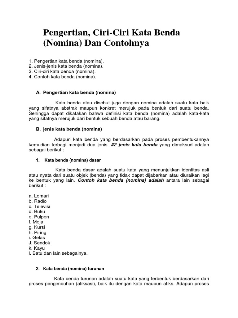 Kata benda dasar atau nomina dasar ialah kata kata yang yang secara konkret menunjukkan identitas suatu benda sehingga kata ini sudah tidak bisa lagi diuraikan ke bentuk lainnya. Jenis jenis kata benda nomina. Contoh kata verba dan nomina. Bagi kalian yang kelas 10 mungkin ada dikasih tugas dari buku paket.