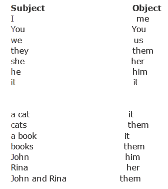 Subjek adalah kata atau frasa yang berfungsi sebagai pelaku pokok bahasan atau penyebab perbuatan. Dalam bahasa inggris kata ganti bergantung pada jenis kelamin hanya saat anda mengganti kata benda dengan bentuk orang ketiga tunggal. Pronoun atau kata ganti menggantikan kata benda. Yang merupakan objek pada kalimat di di atas adalah cake karena cake lah yang menjadi sasaran subjek untuk dibuat.