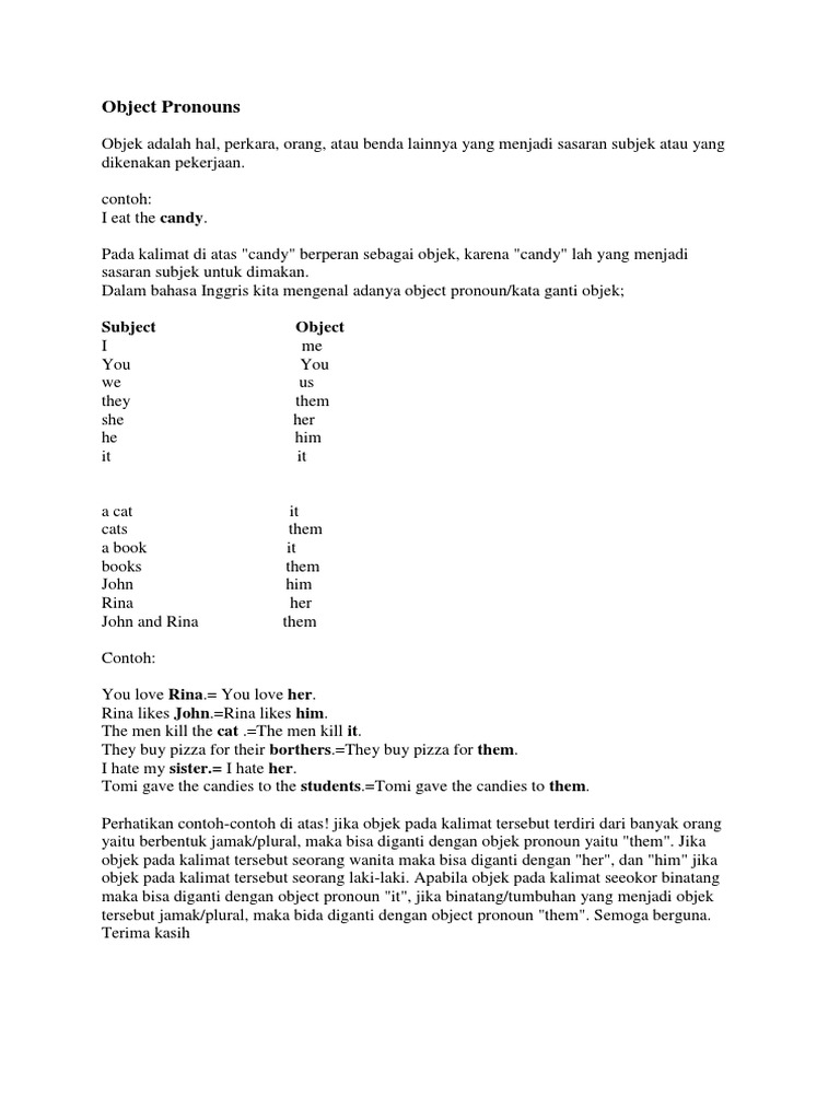 Kata ganti objek dalam bahasa inggris. Kata ganti digunakan untuk membuat kalimat lebih jelas dan efektif. Didalam bahasa indonesia kita telah mengenal dan memahami dengan jelas apa itu spok. Jadi kata ganti dalam bahasa inggris pronoun berfungsi sebagai pengganti kata benda baik itu benda mati maupun makhluk hidup. Dengan mendalami berbagai macam bentuk kata ganti wawasan kebahasaan pun akan menjadi terasah khususnya wawasan ber bahasa inggris.