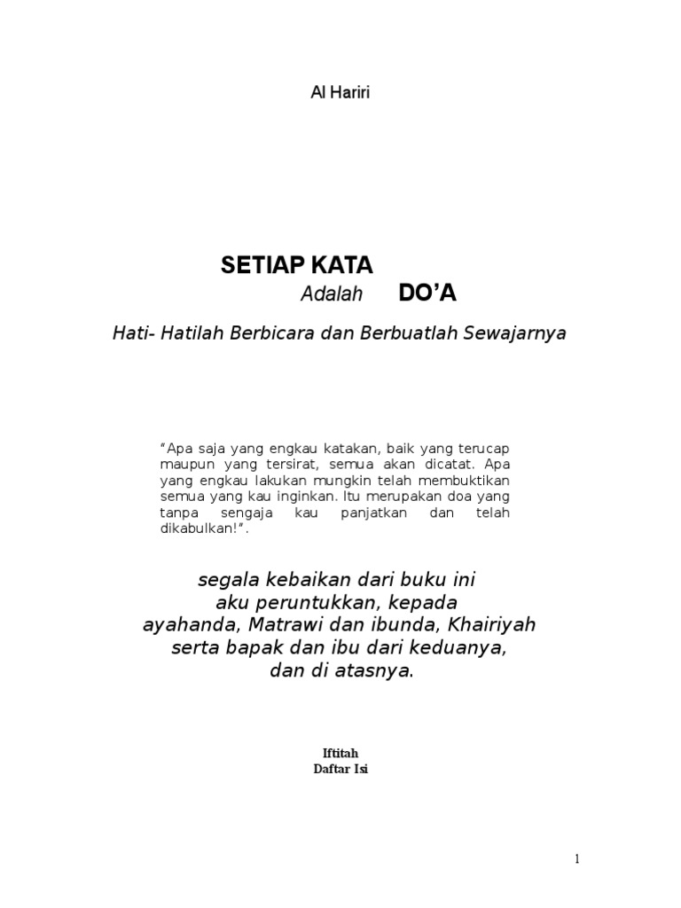 Kata kata adalah doa. Kekuatan doa adalah kekuatan illahi yang tidak dapat diganggu gugat. Dan kita juga sering mendengar serta tau yang kata kata ibu itu adalah satu doa. Karena menurut keterangan mengatakan demikian setiap kata yang terucapkan adalah doa yang terlantunkan. Rasulullah bersabda tidak ada yang lebih utama di sisi allah daripada doa hr ahmaddoa adalah senjatanya orang mukmin pilar agama serta cahaya langit dan bumi.