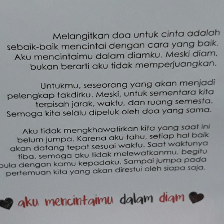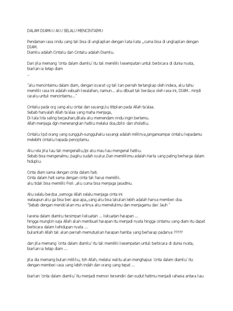 Mencintaimu biarlah menjadi rahasia di dalam sujudku biarlah hanya aku dan allah yg tau merinduimu biarlah menjadi seuntaian kata indah yg kurangkum dalam doa aku serahkan cinta dan rindu ini kepada allah sang pemilik hati ya rabb sampaikan salam ku untuknya dengan cara indahmu dalam desau anginmu yg akan mengantar salam ku untuknya. Kata mutiara gelisah lagi ngetrend kata mutiara dalam diamku 4k. Diamku adalah caraku menjagamu kau terlalu indah sampai lisanku tak mampu lagi berucap kata terbaik yang bisa melukiskanmu kau terlalu sempurna sampai angank. Dan jika memang cinta dalam diamku itu tak memiliki kesempatan untuk berbicara di dunia nyata biarkan ia tetap diam.