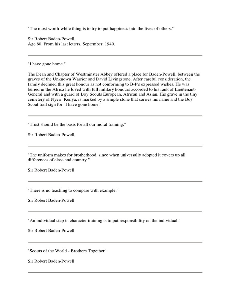 Pesan terakhir baden powell. B p dimakamkan di nyeri kenya dengan batu nisan marmer diukir dengan lambang kepanduan dunia dan kata kata robert baden powell chief scout of the world. 1 2 berikutnya. Colin powell kata kata bijak 1 sd 10 dari 11.