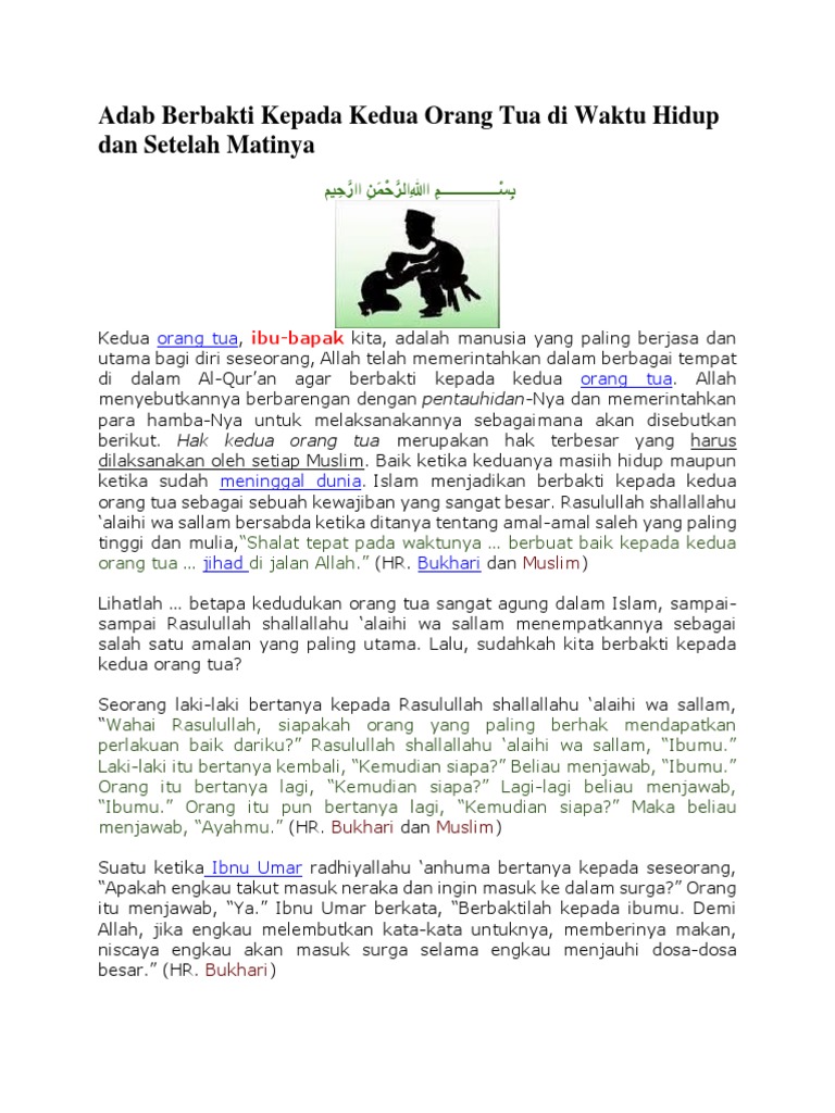 Islam sangat menekankan untuk berbuat baik kepada kedua orang tua atau biasa dikenal dengan istilah birrul walidain. Orang tua adalah orang yang paling berjasa dalam hidup kita. Berbakti kepada tuhan yang maha esa dengan jalan melakukan perintah nya dan menjauhi larangan nya. Berbakti berbakti kata verbia kata kerja arti.