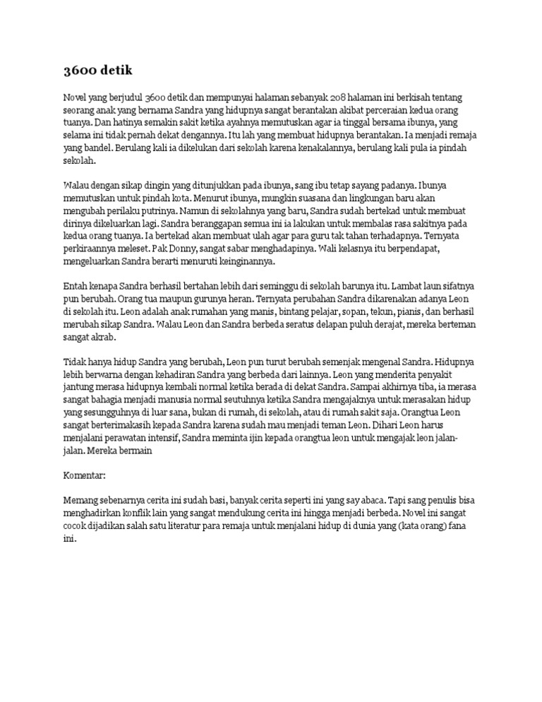 Setiap orang tidak bisa hidup dengan selalu kesepian. Sandra dialah yang menjadi tokoh utama dalam novel ini. Sinopsis novel teenlit 3600 detik karya charon. Dia tidak melihat seorang murid pun disekitarnya.