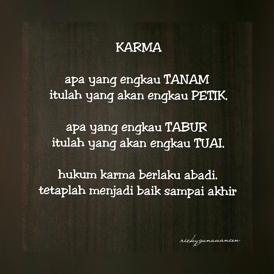 Kumpulan kata kata kutipan kalimat ucapan caption status quotes bijak mutiara motivasi hukum karma berlaku karma menurut kamus bahasa indonesia kata karma adalah sebuah perbuatan manusia ketika hidup di dunia sedangkan kata hukum karma adalah hukum yang menyatakan bahwa siapa yang berbuat akan. Kumpulan kata kata kutipan kalimat ucapan caption status quotes bijak mutiara motivasi hukum karma berlaku karma by posted on june 25 2019. Hidup sebagai umat tuhan itu sekadar melakukan darma dan karma 2 hukum sebab akibat contoh. Unsubscribe from md jaeez.