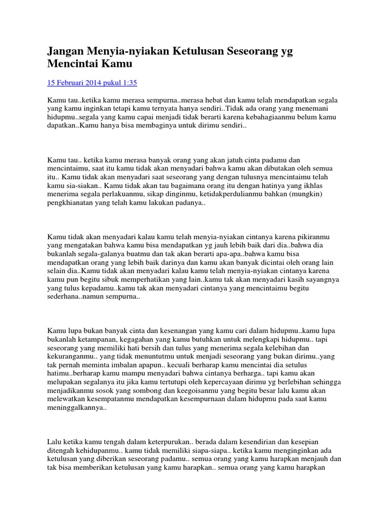 Jangan menyia nyiakan ketulusan seseorang yang mencintaimu bagian 1. Jangan menyia nyiakan ketulusan seseorang yg mencintai kamu. Lalu kamu mengingat semua kata kata yang pernah ia ucapkan padamu. Agar tak tersakiti sedikitpunyang selalu memperhatikanmu yang seringkali mengabaikannyayang dengan beraninya tetap mencintai kamu yang selalu membuatnya sedih dengan segala sikap dan perbuatanmu.