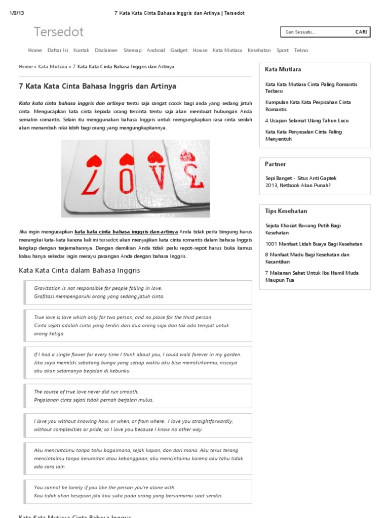 Kamu bisa mencontek kata kata gombal cinta bahasa inggris seperti yang disadur dari merdeka rabu 1762020 di bawah ini. Kata kata cinta bahasa inggris jatuh cinta diam diam terbaru dan artinya jatuh cinta merupakan perasaan mendalam yang begitu menyenangkansiapa yang tak menyukai rasa suka dan cinta yang begitu indah itu. Ketika kita jatuh cinta semua ungkapan yang kita ucapkan akan terdengar romantis. Freeenglishcourseinfo bagi yang sedang jatuh cinta ungkapan cinta romantis bahasa inggris ini mungkin yang sedang anda cari.