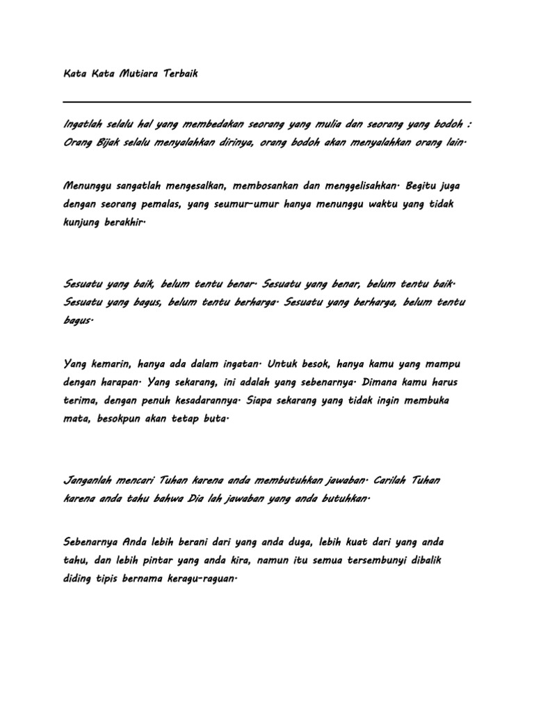 Kata yang baik tentu saja akan membuat hati menjadi tenang dan dapat dijadikan sebagai motivasi untuk ke depannya nanti supaya lebih baik lagi. Kata kata mutiara terbaik pasti walaupun cuma sepentas anda pernahh menonton salah satu program di televisi swasata indonesia yang berjudul golden ways. Berikut adalah 30 kumpulan quotes kata kata mutiara bijak sebagai motivasi diri menjadi yang lebih baik dari hari kemarin. Layaknya roda kehidupan yang terus berputar terkadang kita sering merasa masalah yang kita hadapi berat dan membuat kita berpikir bahwa masalah tersebut tidak akan berlalu.
