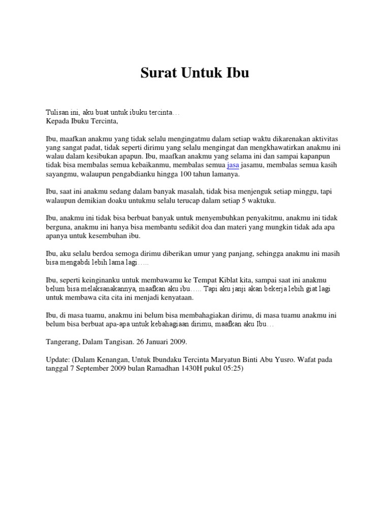 Ibu maafkan aku yang sampai saat ini masih belum bisa untuk membahagiakanmu sepenuhnya masih saja ada kesedihan yang aku torehkan dalam setiap hari harimu maafkan aku kesuksesan belum ada di tanganku tetapi aku yakin doamu untukku dalam meraih cita cita dan kesuksesan selalu kau panjatkan untukku 3. Ibu maafkan aku yang sampai saat ini masih belum bisa untuk membahagiakanmu sepenuhnya masih saja ada kesedihan yang aku torehkan dalam setiap hari harimu maafkan aku kesuksesan belum ada di tanganku tetapi aku yakin doamu untukku dalam meraih cita cita dan kesuksesan selalu kau panjatkan untukku 3. Ibu maafkan aku yang sampai saat ini masih belum bisa membahagiakanmu sepenuhnya. Ibu maafkan aku selama ini aku belum bisa membalas kasih sayangmu belum bisa membahagiakanmu secara lahiriah.
