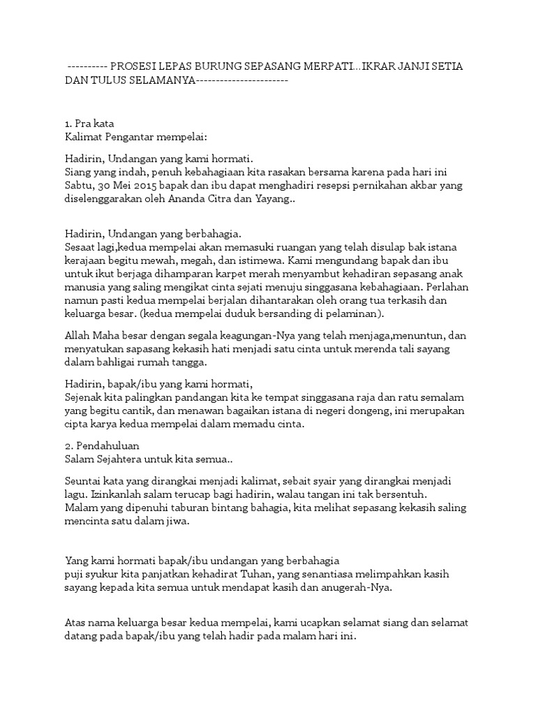 Kata kata mc pernikahan. Tapi tentunya harus ada contoh naskah mc akad nikah yang benar agar si mc bisa membawakan acara dengan sebaik baiknya. Teks mc pernikahan. Contoh naskah mc acara pernikahan bahasa indonesia pada kesempatan kali ini kami akan memberikan contoh teks untuk naskah pembawa acara mc untuk acara resepsi pernikahan dalam bahasa indonesia yang baik dan benar. Kalau begitu sahabat pernikahanasia butuh mc yang bisa membawakan susunan acara akad nikah anda dengan benar.