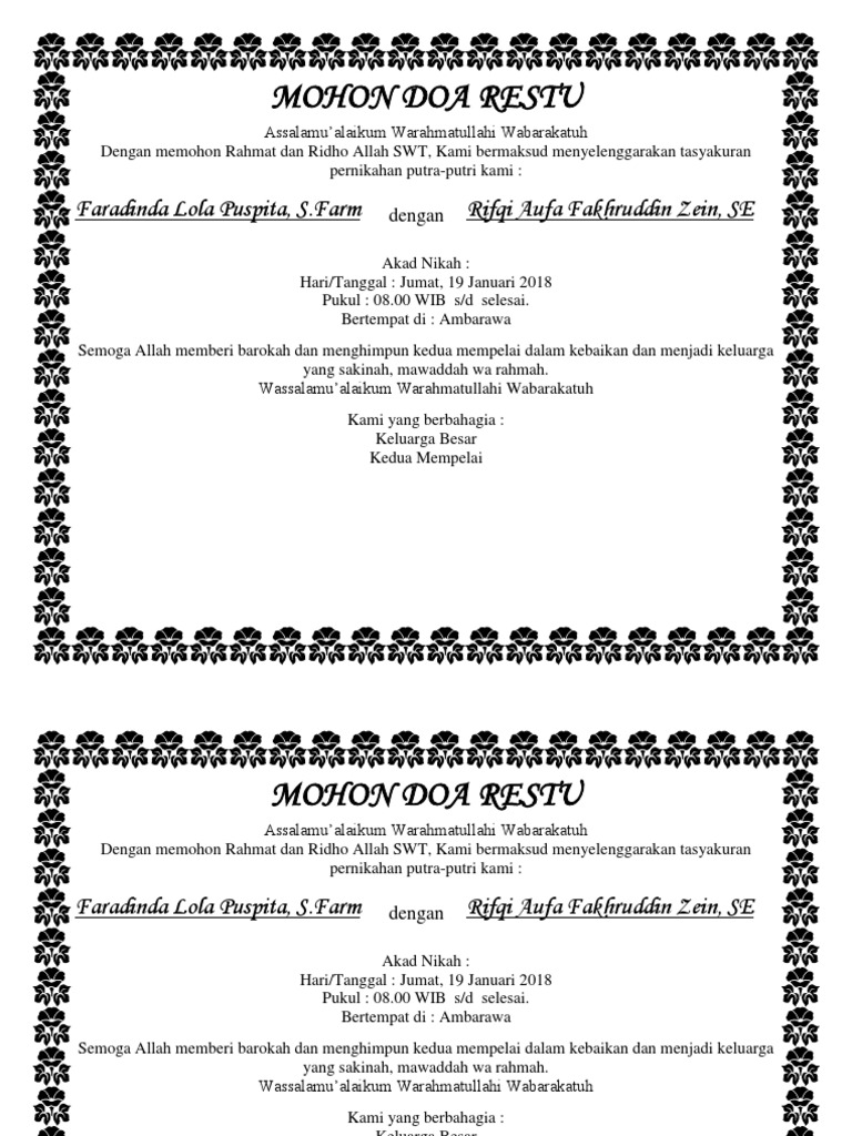 Mohon doa restu anda merasa perlu meminta izin untuk menikahi pasangan. Untuk mengundang orang lain secara resmi ke pesta pernikahan tersebut maka anda bisa memberikan surat undangan pernikahan kepada mereka. Download 150 desain undangan word gratis hanya desain bukan. Tebarkan kesejukan di hatiku.