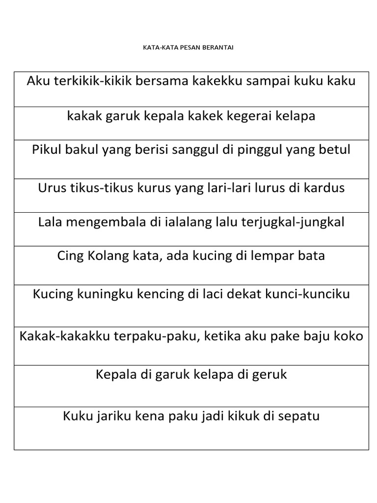 Kata kata pesan berantai. Kata kata menerima cinta seseorang. Setiap kelompok akan mendapat pesan dari seorang fasilitator bisa seorang guru atau murid yang disampaikan kepada murid di barisan paling depan. Sederhananya komunikata adalah sebuah permainan kelompok yang dimainkan dengan cara menyampaikan pesan secara berantai dari orang pertama. Puisi berantai puisi berantai adalah gabungan antara beberapa puisi yang saling berkaitan dan dibacakan sekaligus dalam satu kesempatan penampilan.