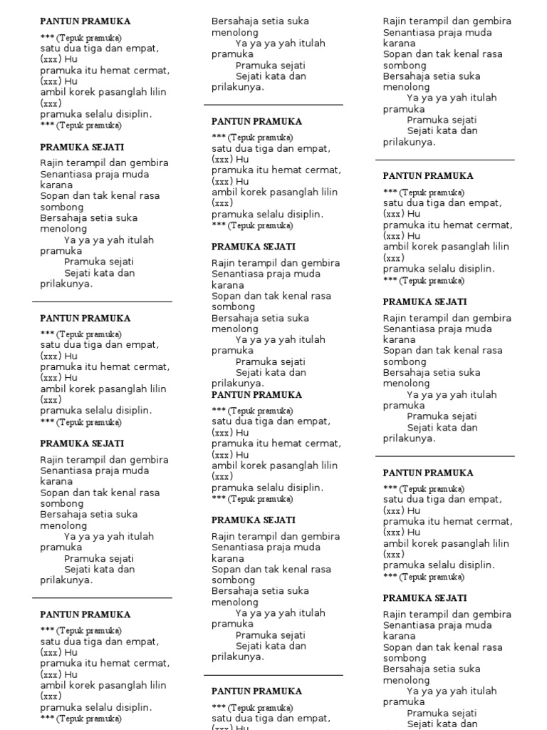 Rajin terampil dan gembira. Pramuka tidak pernah terkejut. Silakan membagikan tulisan ini apabila kamu merasa bermanfaat. Semoga kamu dapat terhibur mendapatkan inspirasi kata kata untuk menyebarkan semangat positif pramuka ke orang lain.